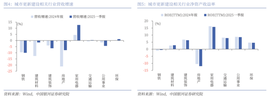 2025年一季报显示,钢铁、建筑材料、建筑装饰、房地产、公用事业等行业营业收入均同比负增长,家用电器、交通运输、环保行业的营业收入同比正增长。从盈利能力来看,钢铁、房地产行业的ROE(TTM)为负值,即未实现盈利;建筑材料行业的ROE(TTM)也相对较低。随着创新、宜居、美丽、韧性、文明、智慧的现代化人民城市建设开展,城市更新相关行业业绩有望显著改善。